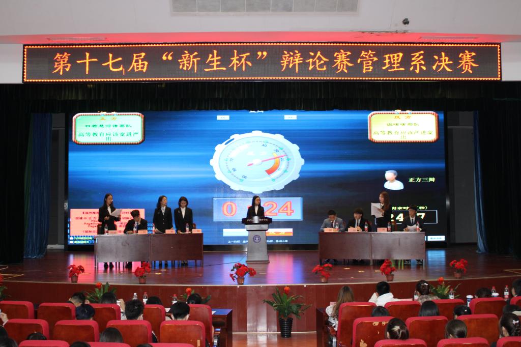 管理2101班的“口若悬河诸葛队”队和管理2101班的“说啥啥都队”队成功晋级了决赛。决赛双方以高等教育是应该宽进严出还是严进宽出展开辩论。