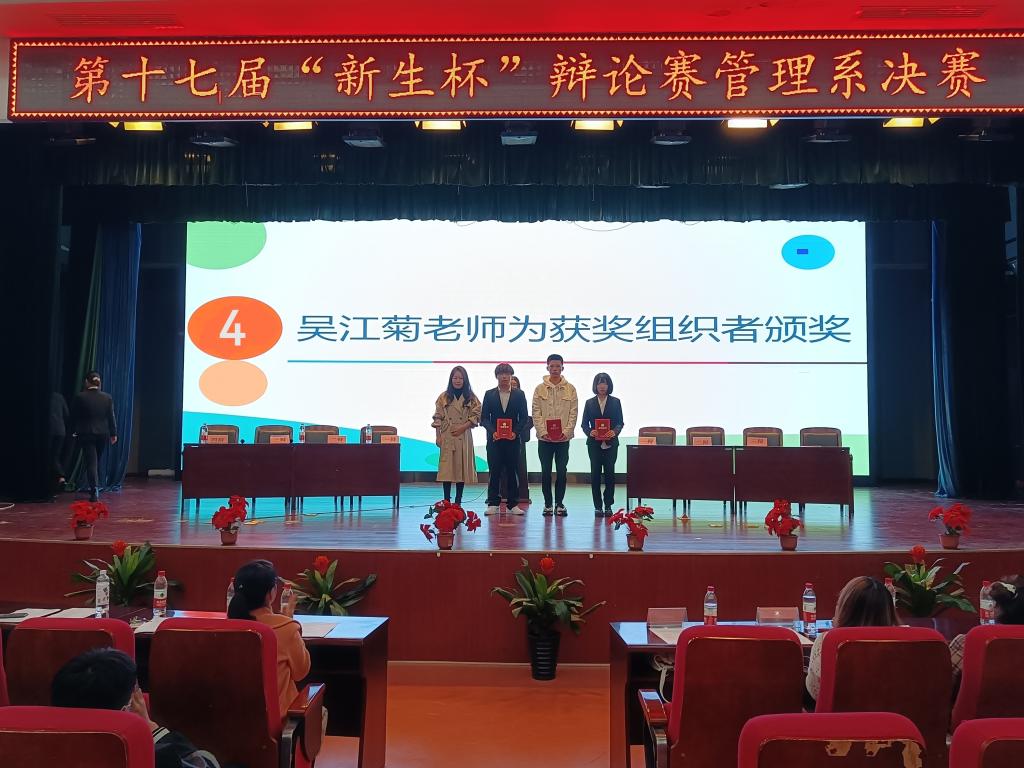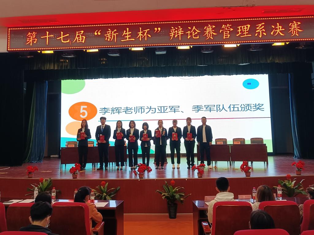 为丰富管理系21级新生的课余活动,培养同学们的思辨能力和语言表达能力,yl7703永利官网管理系于10月14日在教二报告厅举办了第十七届“新生杯”辩论赛的决赛暨颁奖典礼。参加本次比赛的人员有管理系团工委负责人吴江菊,学工办老师李璐、李辉、胡晓莉。评委由丁娅楠、李智彤、过旭晗同学共同担任。