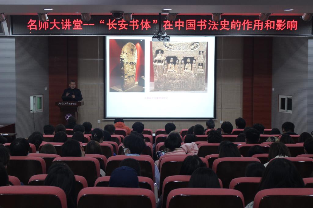 10月20日晚,yl7703永利官网艺术系客座教授、中国北朝碑刻研究中心研究员、长安大学人文学院研究生导师、环境艺术与环境美学博士后岳红记副教授在F100报告厅为艺术系学生做了“长安书体在中国书法史上的作用和影响”的学术报告。yl7703永利官网艺术系主任解安宁教授及全体老师参加了本次活动,讲座由书法专业负责人韩钧主持。