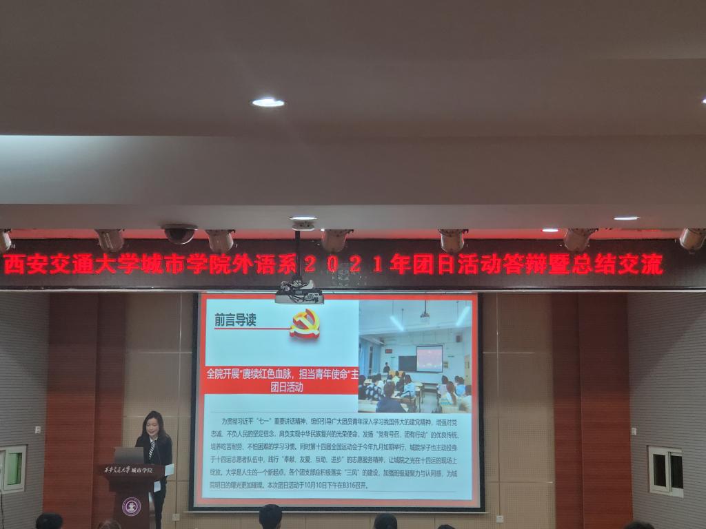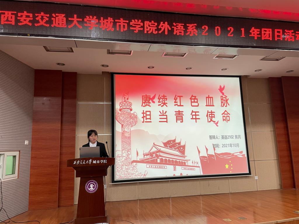 全体人员起立齐唱共青团团歌,随后,各班团支书向大家展示各团支部丰富多彩的主题团日活动。本次团日活动以“赓续红色血脉,担当青年使命”为主题,从“习近平七一重要讲话精神、请党放心,强国有我、助力十四运奉献我的城、共创学院学风同写未来篇章”四个方面开展具体活动,不仅丰富了同学们的课余生活,还增强了团支部的凝聚力。其中,英语2001、英语类2104等五个班级走进张学良公馆、八路军办事处等红色基地,置身于革命先辈奋斗的地方回望历史、缅怀先烈,留下参观vlog;英语2003班黄佳怡分享了十四运志愿者经历,号召同学们在实践中奉献自我,提升综合能力,做新时代有光荣感、责任感、使命感的共青团员。