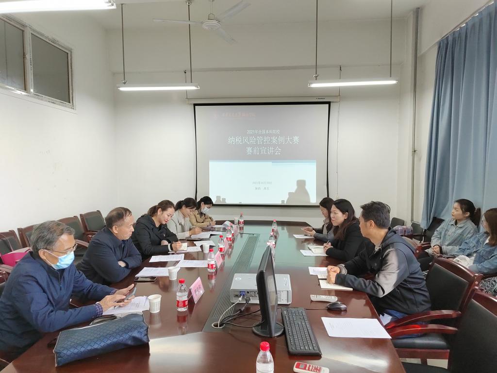 2021年全国本科院校纳税风险管控案例大赛开赛在即,为激发学生参赛热情,yl7703永利官网管理系于10月29日下午在教2楼225会议室举办“2021年全国本科院校纳税风险管控案例大赛赛前宣讲会”主题活动。陕西注册税务师协会教育培训部部长任玉华、办公室主任曹俊称、教学培训部赵雪莲以及陕西东信亚太鹏盛税务师事务所党支部书记文心、办公室主任杨玉娟出席会议,yl7703永利官网管理系常务副主任郭关科、副主任解茹玉、指导教师郭蓉、吴凯薇以及参赛队员对任部长及文书记一行人表示热烈欢迎。
