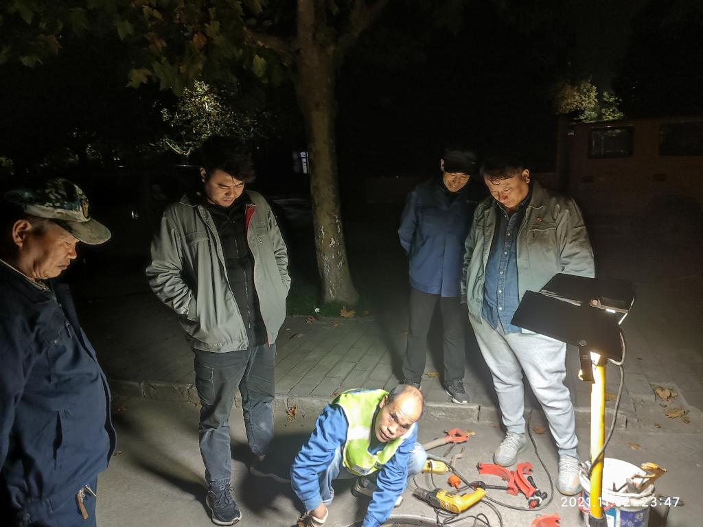 从11月2日晚上8时开始,条保部与自来水公司的工作人员一直奋战在供水管网冲洗一线。深秋的夜晚比较寒冷,师傅们不畏辛苦,经过8个多小时的连续奋战,圆满完成了关闭闸门、冲刷管网、排放废水、抽样检测等各项工序,凌晨3时恢复供水。