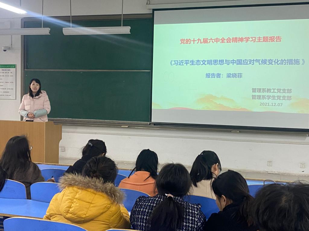 为深入学习贯彻党的十九届六中全会精神,领悟党的百年奋斗历史经验,12月7日中午,管理系教工党支部、管理系学生党支部组织全体党员同志及部分群众在教2-216召开党的十九届六中全会精神学习主题报告,本次报告邀请思政部梁晓菲主讲。教工党支部书记解茹玉主持。
