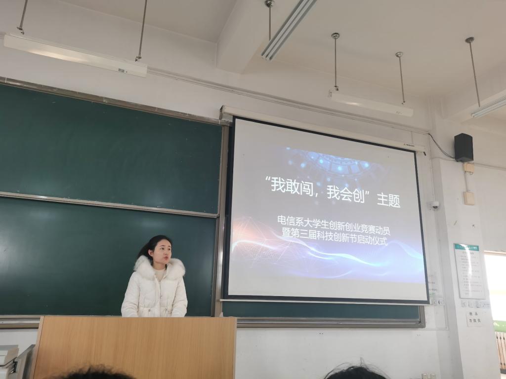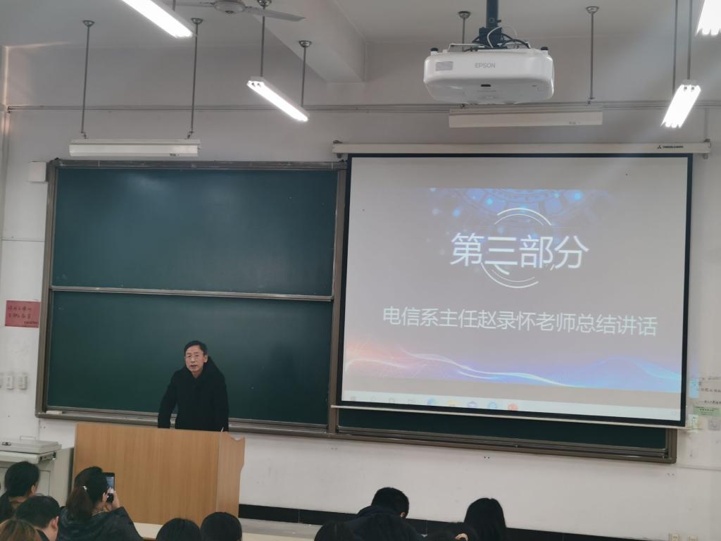 系学工负责人王姣总结了上年度电信系双创比赛的参赛与获奖情况,并对本年度竞赛的具体安排做一部署;主任助理张建进行教师代表发言,他指出创新创业是促进大学生全面发展的重要平台,也促进了指导教师教学与科研的有机结合,大家要充分利活动契机把自己好的创意想法展示给别人,力争在交流中实现创新和科技成果转化;最后,电信系主任赵录怀进行总结,他强调创新创业大赛有效促进了双创人才培养质量的提升、学生创新创业精神的培育及教师教育观念的转变和教学能力的提高,希望同学们在大赛中学习新知识、汲取新思想,同时呼吁教师队伍要发挥主体意识和责任意识,共同努力创造更多的双创成果。