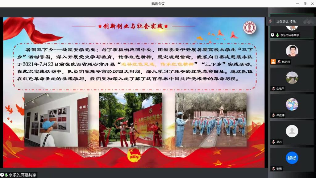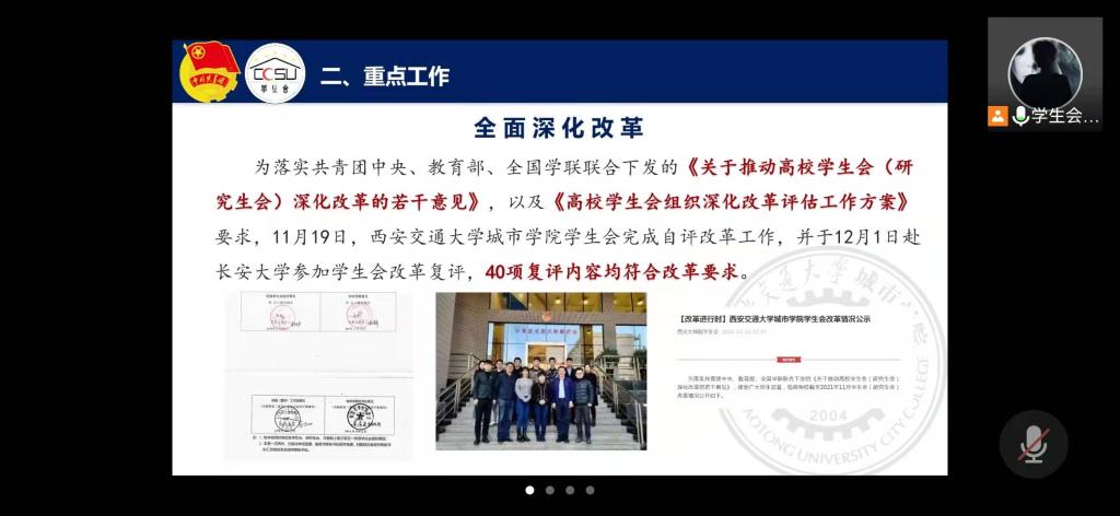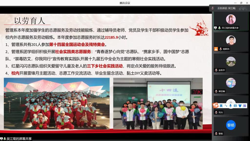 根据“双述双评”述职评议原则,团委书记茹静老师向各团学组织进行2021年度共青团工作汇报,2021年共青团工作在青年团员思想引领、深化组织改革、新媒体宣传发展、校园文化活动、志愿服务和社会实践等方面创新发展,成绩显著。各系团工委书记分别以思想引领、学生社团管理、校园文化建设、志愿服务项目、新媒体宣传、日常服务管理和社会实践等方面为重点,突出各系特色,彰显组织活力。学院团委五个职能部门及六个学生组织的第一负责人以思想引领为着力点,夯实基层建设,主抓新媒体宣传,各项工作均有显著提高。同时,各系学生会执行主席围绕精简部门、从严治会、服务同学、明晰遴选原则等学生会改革重点工作汇报成效,突出亮点,为培养“阳光型”学生会奠定坚实基础。通过精彩的述职可以看到这一年来他们的竭力付出和取得的优异成绩,为打造繁荣校园文化、烘托活力校园氛围不断蓄力。