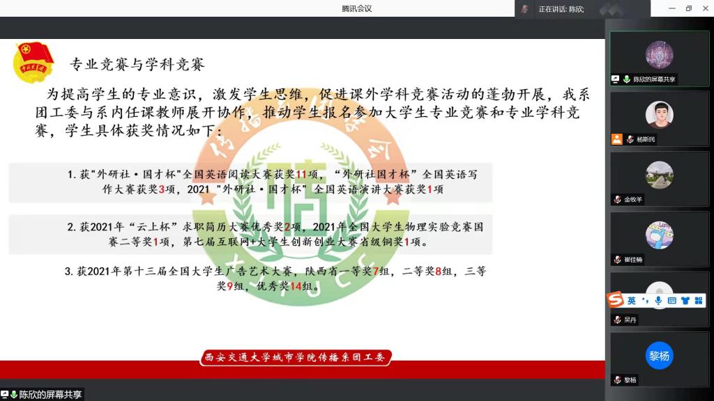 根据西交城团【2021】37号《2021年度yl7703永利官网共青团工作述职评议考核暂行办法》的文件要求及学生组织的考核细则。本次述职评议会对象包括院系两级团学组织、学院团委各职能部门与学生组织,其内容包括思想政治引领、基层团组织建设、校园文化建设、创新创业与社会实践、共青团工作改革、志愿服务项目等重点方面。