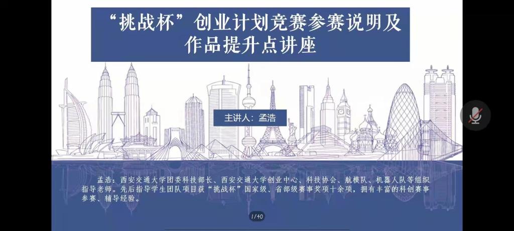 为激发我院学生刻苦钻研的实践能力,培养学生创新创业氛围,3月22日晚,由学院团委主办的“挑战杯”创业计划竞赛参赛说明及作品提升讲座在腾讯会议线上进行。西安交通大学团委科技部长孟浩应邀为我院师生作报告,学院团委干事黎杨主持讲座,我院报名参赛的500多名同学参加讲座。