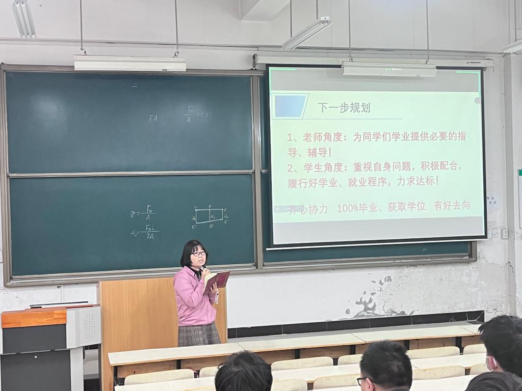 郭老师为大家讲解了毕业生在毕业设计、学习考证等过程中存在的问题,对态度不端、不负责任的同学进行了批评教育,并向大家明确了系里针对毕业生就业、学业所采取的帮扶和促进计划,希望同学们重视自身发展问题,师生积极配合,顺利实现大学目标。最后,同学们就毕业和就业活动中存在的疑惑和问题与两位老师进行了交流。