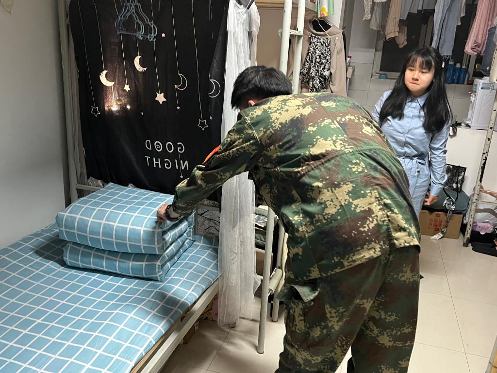 检查开始前,营长杨耀聪指出,内务检查的目的是规范学生们的生活习惯,使同学们拥有井然有序的大学生活和宿舍环境。