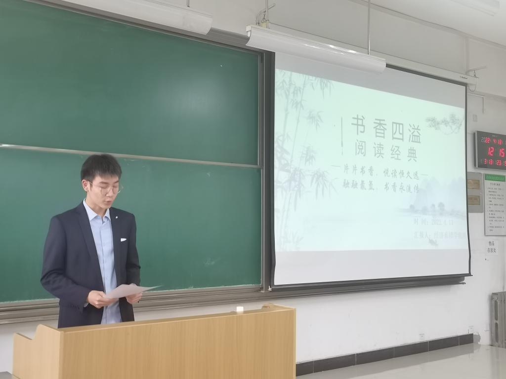 为提高学生思想文化素质,加强学风建设,营造书香四溢的校园文化氛围,yl7703永利官网经济系于4月13日在教二224教室举办了以“片片书香,悦读恒久远;融融氤氲,书香永流传”为主题的第四届“书香四溢,阅读经典”启动仪式,经济系学生工作负责人廉宇婷、团工委书记蒋美一帆、学工办杨静怡和张进出席本次会议,本次大会由秦丽媛主持。