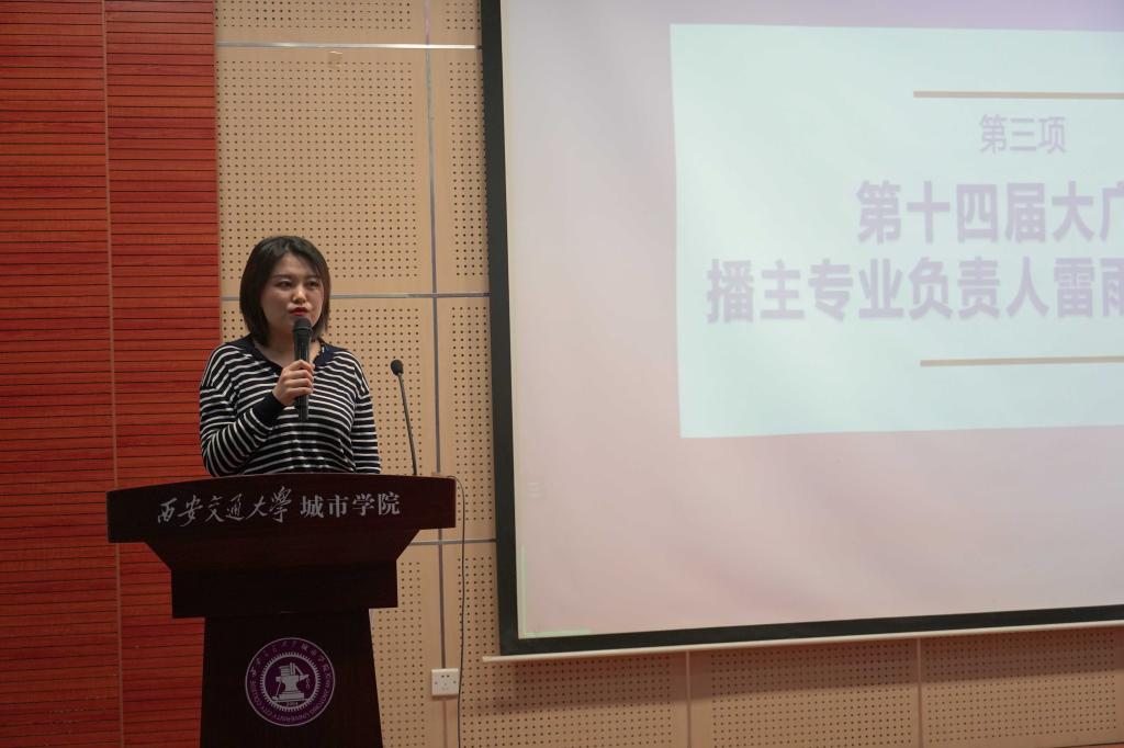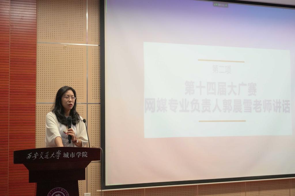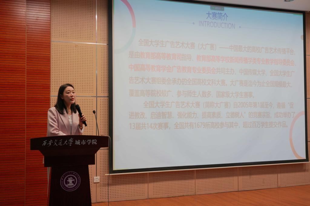 传播系大广赛负责人孙菡忆老师介绍参赛流程,并进行赛前动员。孙老师强调大广赛是一项含金量高、覆盖面广的全国性比赛,希望同学们重视并积极参与。随后,孙老师就参赛作品命题,作品类别以及往届参赛概况进行讲解,鼓励同学们深入了解选题,选择兴趣点,把个人思考与团队头脑风暴相结合,与老师、同学积极合作。
