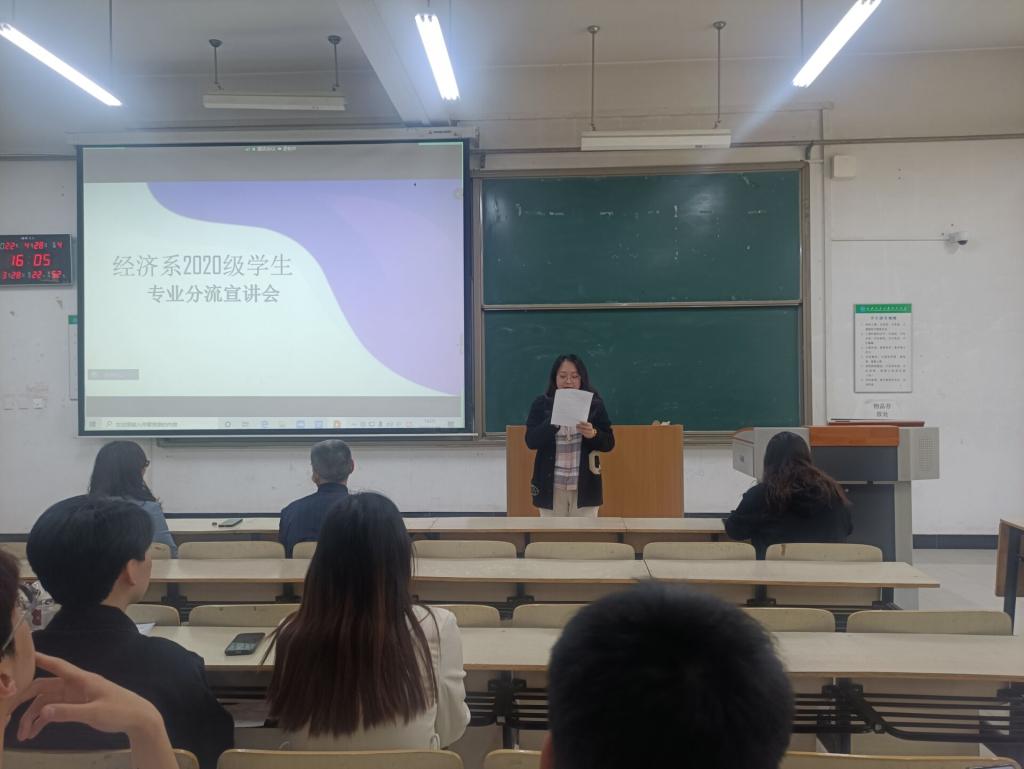 4月28日,yl7703永利官网经济系在E100召开2020级经济类专业分流宣讲会。本次宣讲会由经济系国贸专业负责人王世杰、金融专业负责人李茂盛、财政专业负责人张娜主讲,经济系主任助理廉宇婷主持会议。