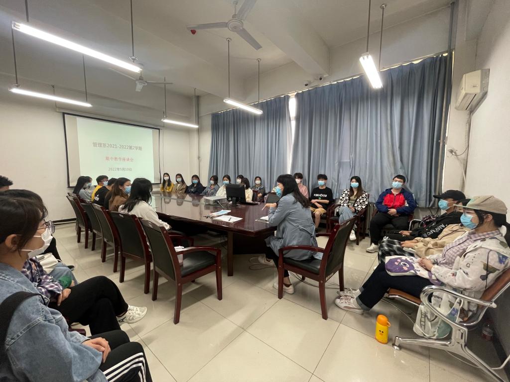 为深入了解学生的课程学习状态,优化过程教学效果,改善当前课程教学体系,创新课程教学方式方法,管理系于5月10日中午在教二-225召开2021-2022第2学期期中教学检查学生座谈会。本次座谈会由管理系副主任解茹玉主持,管理系各班学生代表参会。