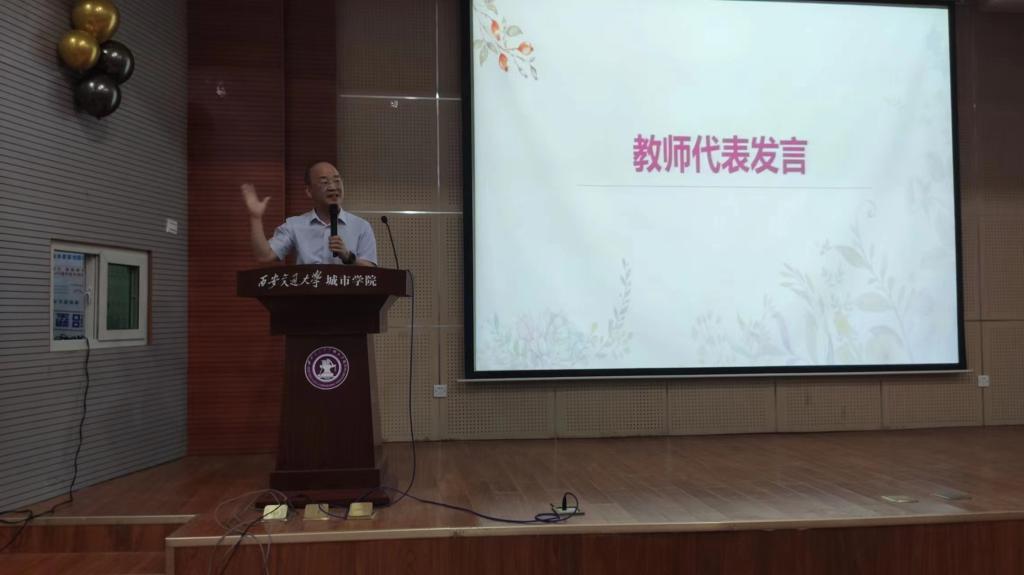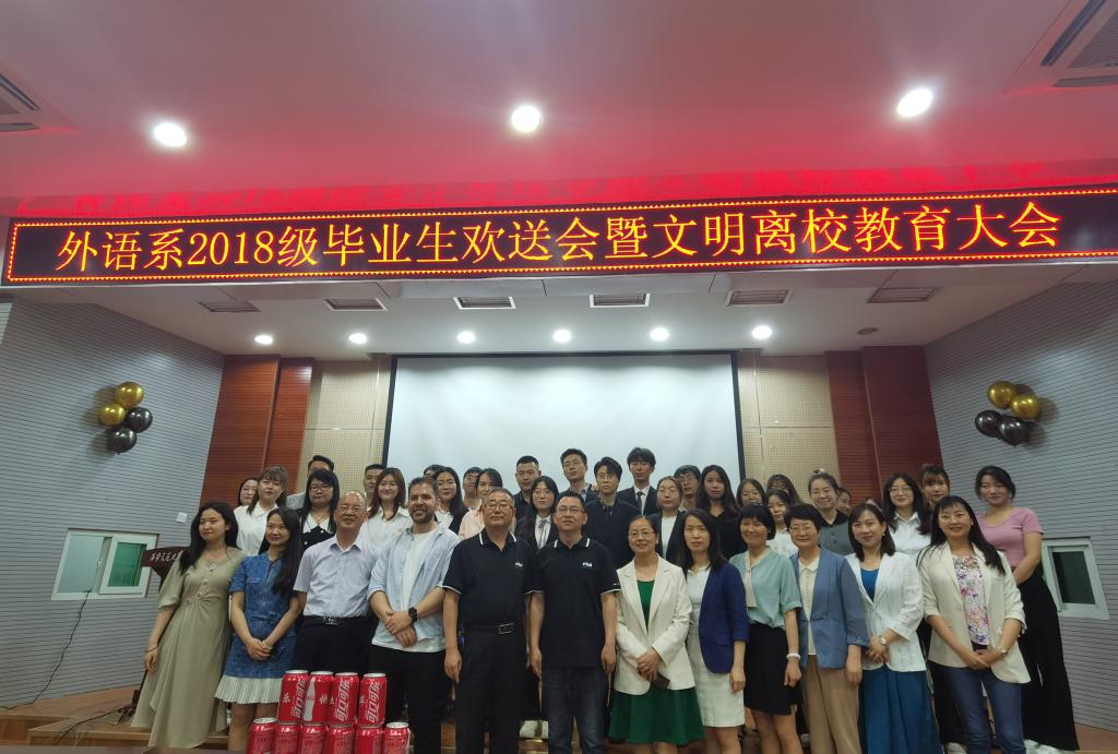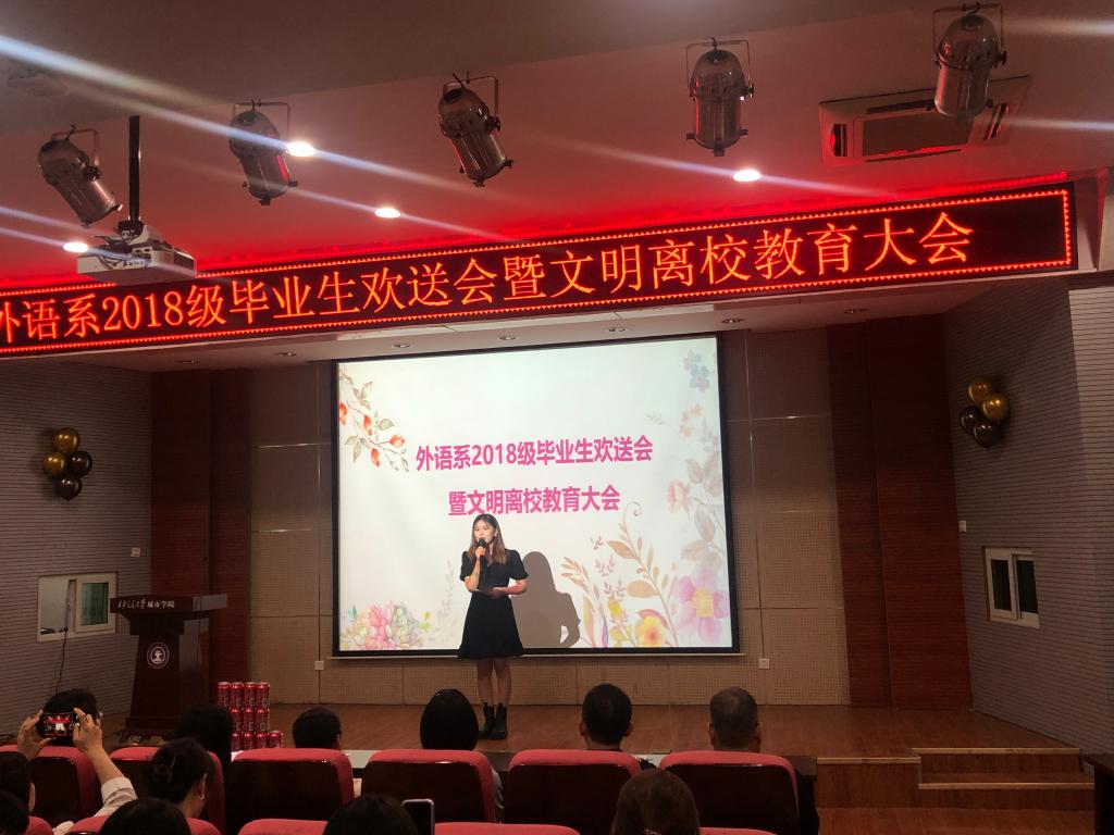 答辩结束后,全体师生在F100参加了毕业生欢送会暨文明离校教育大会。大会伴随着《凤凰花开的路口》的歌声拉开了序幕。首先播放的是由同学们四年间珍贵瞬间组成的照片视频,接下来是教师代表赵永生对毕业生致辞,表达了对同学们的祝福与希冀。