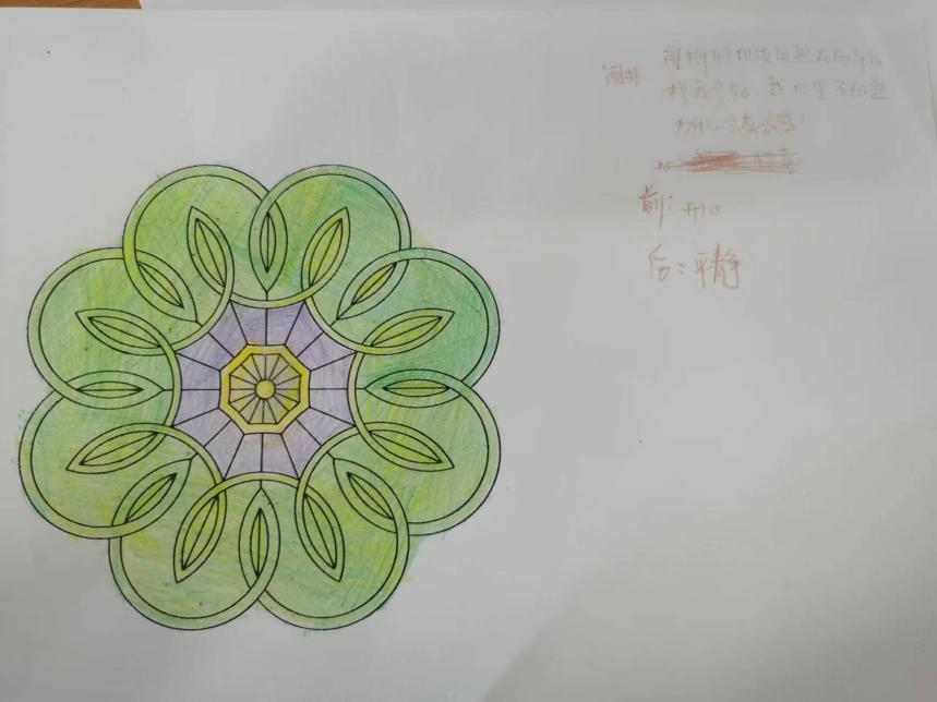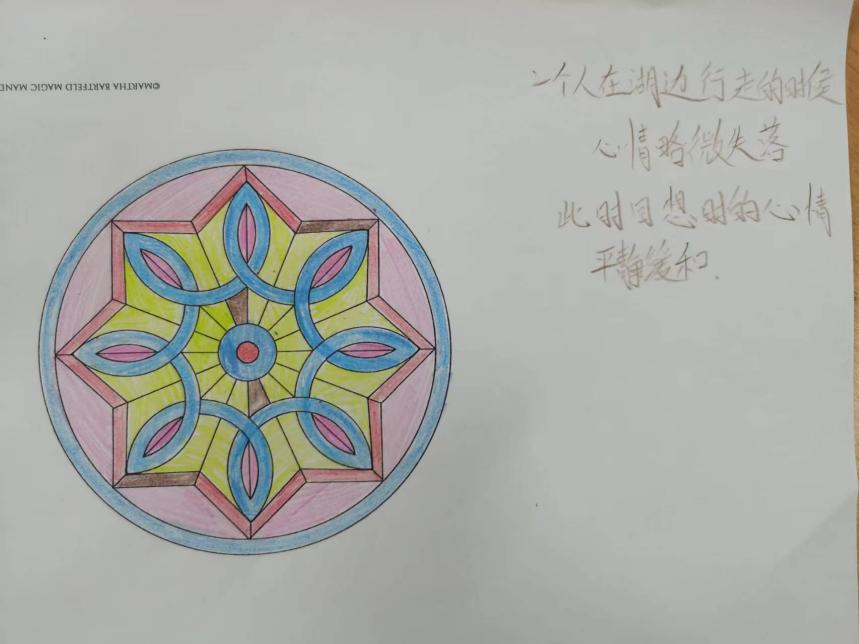 最后进入“曼陀罗”绘画环节。张老师首先讲解了“曼陀罗”相关知识,从现实生活中的“曼陀罗花”到“曼陀罗绘画”,以及其在心理学中的有效运用。当轻柔的背景音乐响起,同学们选择自己喜欢的颜色,将曼陀罗画涂成心目中的色彩,在绘画过程中,仔细感受自己当下的心情。
