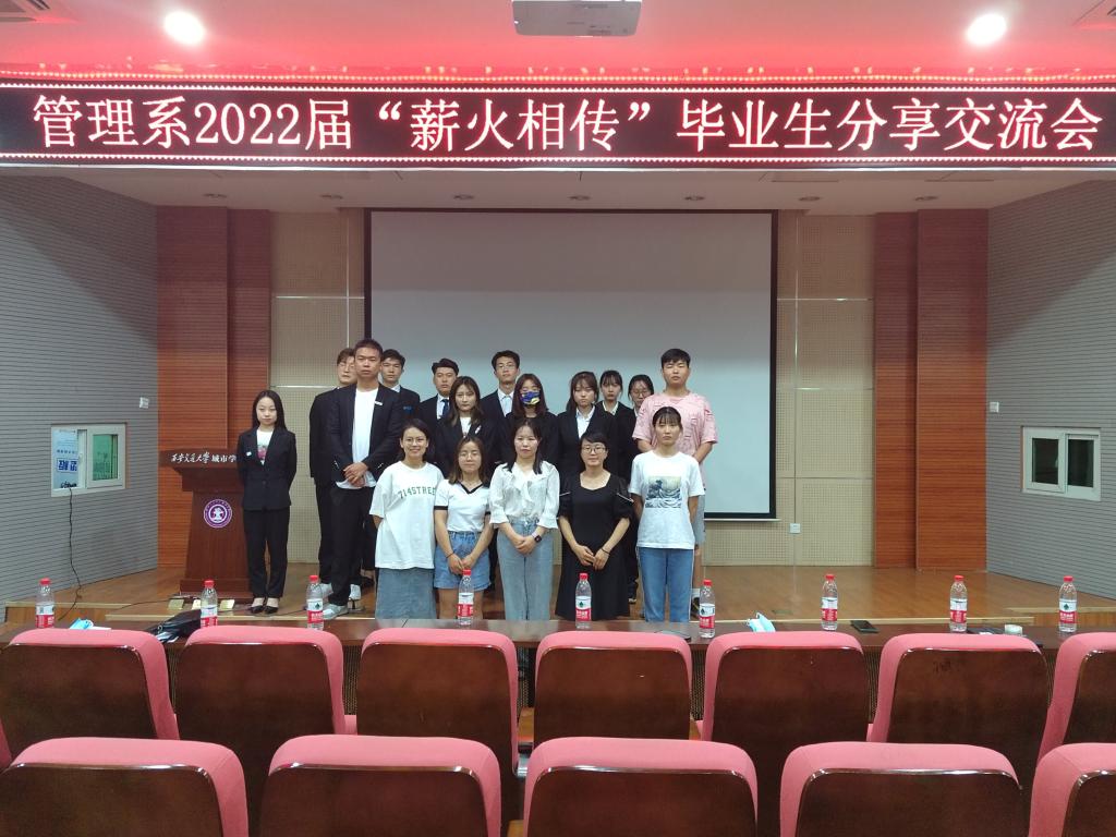 为帮助管理系学子更清晰地找准自身定位,更有效率地参与大学期间的学习生活,管理系于6月7日在F100举办“薪火相传”2022届毕业生分享交流会。参加本次会议的人员有管理系团工委书记吴江菊、管理系学工办老师胡晓莉、优秀毕业生代表及学生代表。