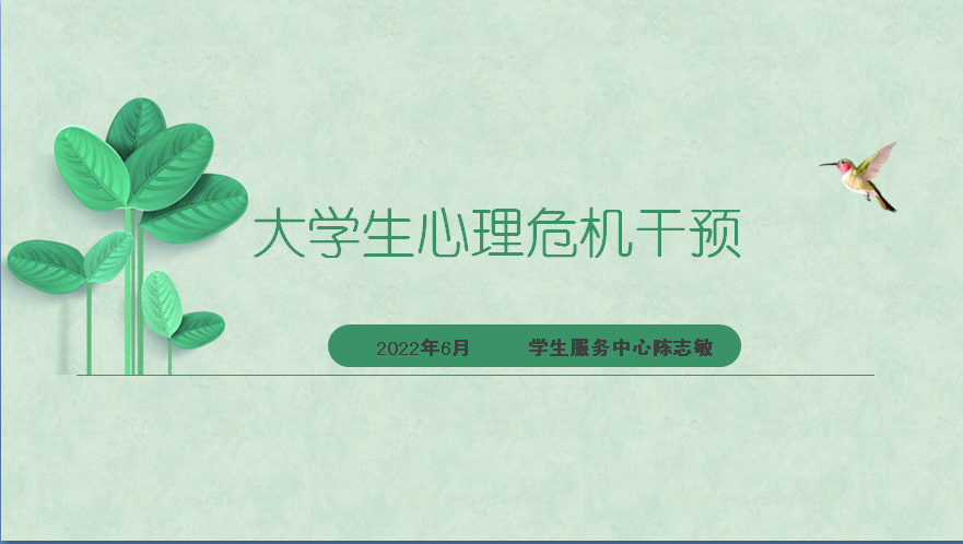 本次培训以“大学生心理危机干预”为主题,陈老师从“认识心理危机”入手,介绍了心理危机的标准、类型和反应表现;分享了心理危机预警信号的觉察,以及心理危机干预要领,让心理委员深入理解和掌握对心理危机预警信号的辨别,及时做好汇报和沟通。陈老师结合案例,帮助心理委员逐步了解心理危机发生之后的系列反应过程和心理需要,同时也说明了正确对待心理危机,尽量减少心理危机影响的重要性。
