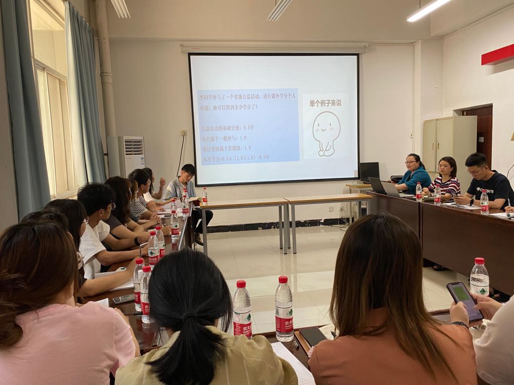 6月17日下午,学生服务中心在综合楼112会议室举办学生课外学分认定培训会,机械系主任助理吴昊翔、电信系主任助理王姣、传播系主任助理杨耀聪、各系学工办老师代表和部分学生代表参加了会议。会议由学生服务中心主任助理姚敏主持。
