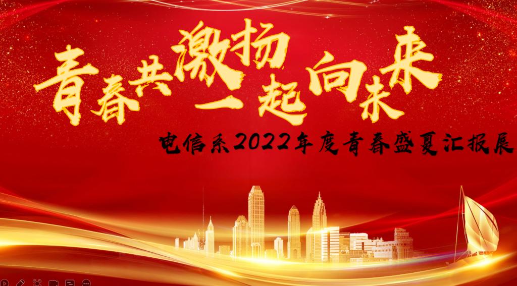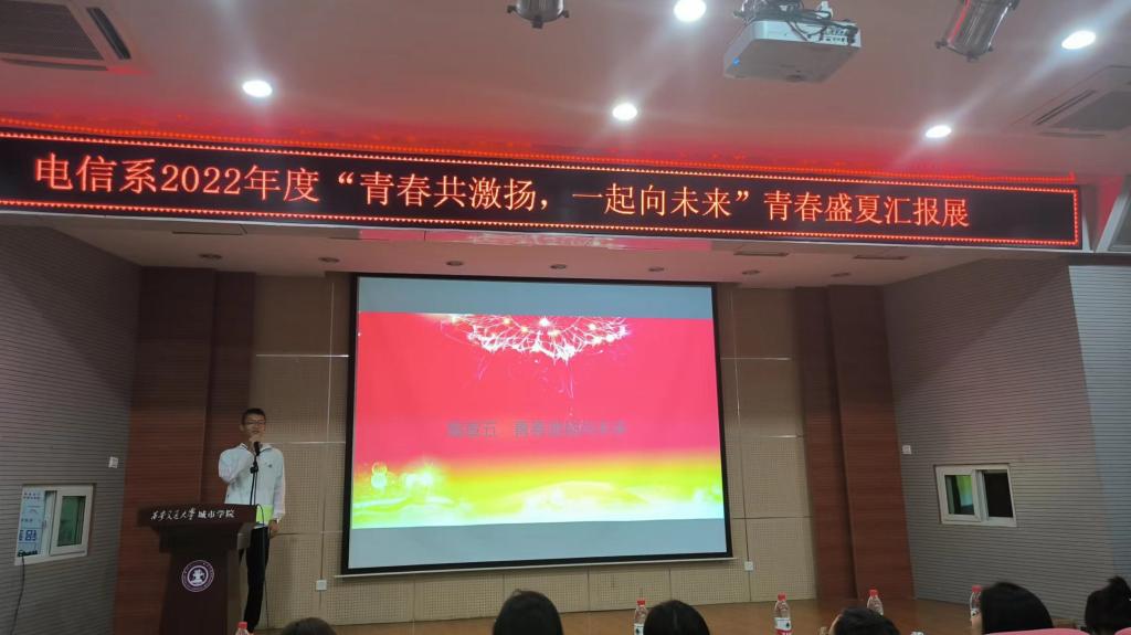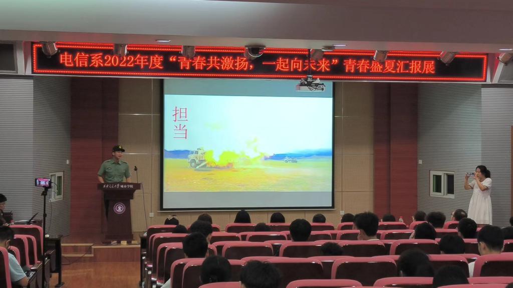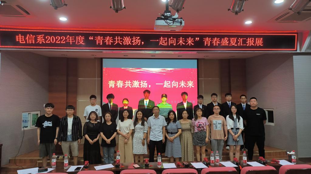 追忆峥嵘岁月,彰显青春担当。6月20日晚,电信系2022年度青春盛夏汇报展在F100报告厅举办。本次青春盛夏汇报展主题为“青春共激扬,一起向未来”,采取“线上腾讯会议直播互动+线下现场参与”的形式开展,莅临本次汇报的领导及嘉宾老师有机械系团工委书记李乐,护理系团工委书记张妙寒,艺术系团工委书记杨梦圆,管理系团工委书记吴江菊,电信系主任赵录怀,电信系副主任刘晓明,电信系主任助理王姣,中兴通讯技术学院学生主管樊超,电信系团工委书记徐娟,电信系辅导员张华、梁新雨、史甜甜。本次汇报展由郭宇轩主持。