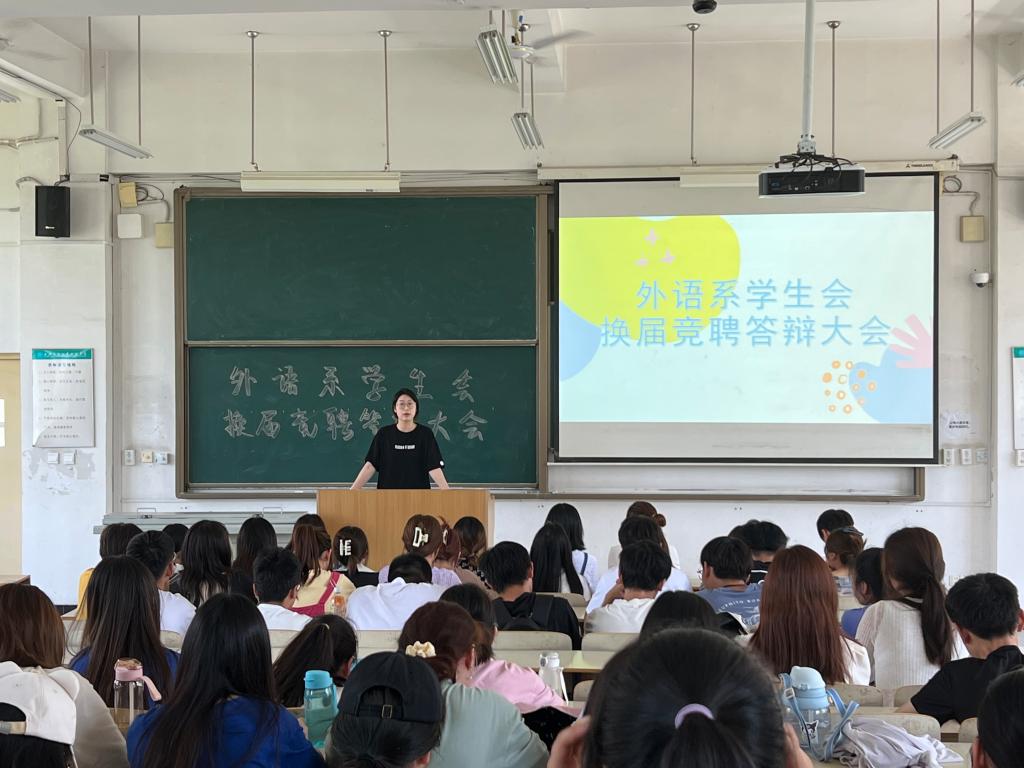 外语系于6月27日在B300召开学生会换届竞聘答辩大会,分为主席团竞选和部门负责人竞选两部分。在竞聘答辩环节,部门负责人对各部门一年来的工作开展情况和未来工作规划进行汇报,重点从工作成效、竞聘优势等方面进行述职,他们表示在今后的工作中将继续尽职尽责,以饱满的热情、端正的态度做好本职工作。在评审提问环节,老师们围绕如何协调工作与学习的关系、对未来部门发展的建议等展开针对性提问,竞聘者提出工作设想,表示会不负老师和同学的信任,脚踏实地,认真实干,全心全意为同学服务。