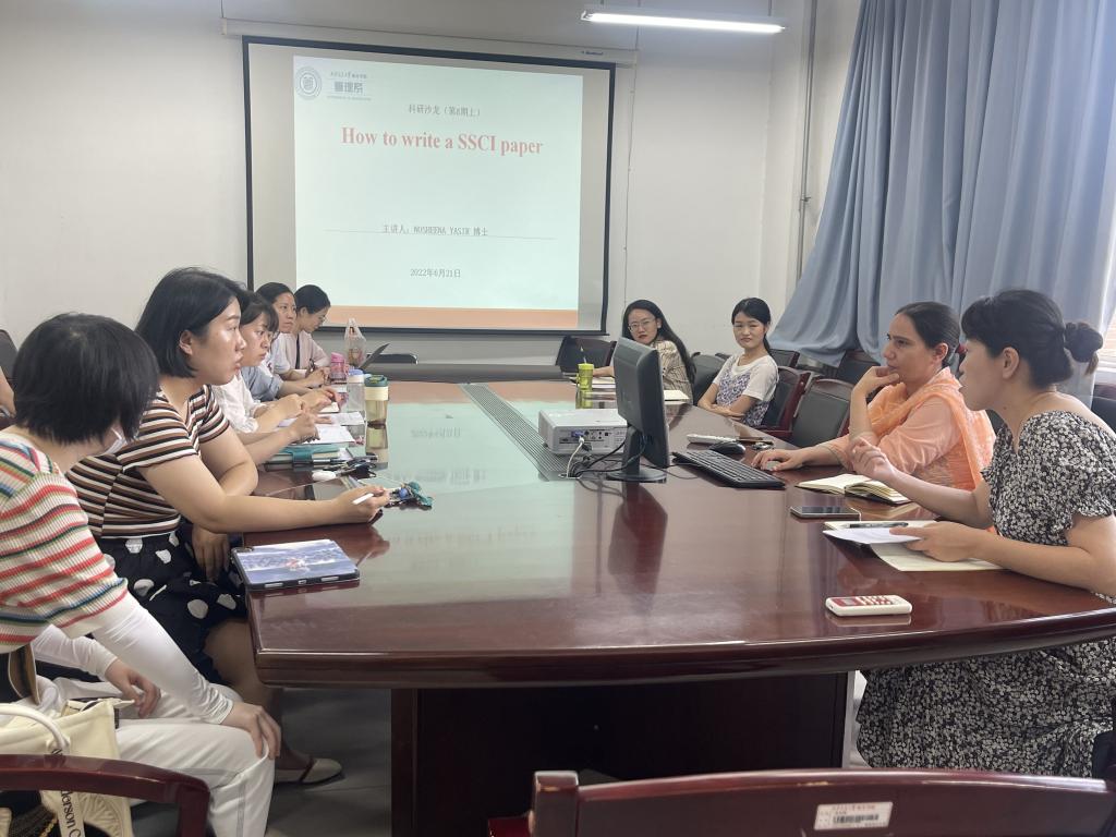 活动中,Yasir博士以“How to write a SSCI paper”“How to make sentence during writing SSCI paper”为主题,以自己发表的5篇SSCI期刊论文为例,向青年教师介绍中英论文框架的区别、常见英文表述错误、如何提升英文写作等,以及SSCI期刊的选刊、审稿要点以及与编辑沟通等方面展开,使得青年教师对SSCI期刊的审稿流程有所了解。此外,Yasir博士还分享了两点投稿经验:第一,选择契合自己研究方向的期刊投稿;第二,多涉猎才能多输出,要学会用英文学术性语言进行表述。