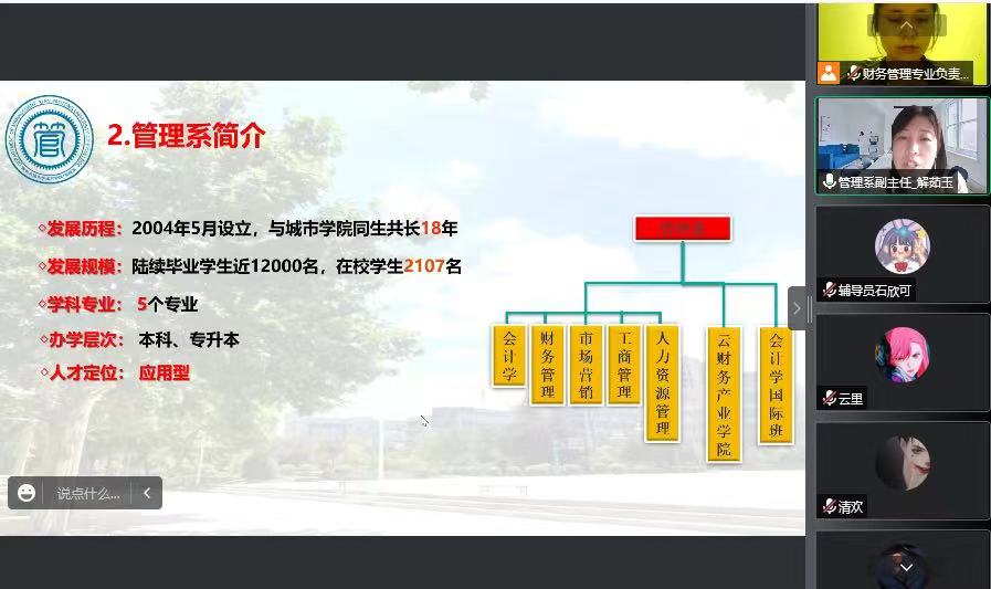 为促进管理类全体新生对管理系专业的进一步认识和了解,明晰个人专业发展规划与方向。自9月3日至9月6日,会计学专业、财务管理专业、工商管理专业、人力资源管理专业、市场营销专业分别在腾讯会议上进行了专业认知教育会议。