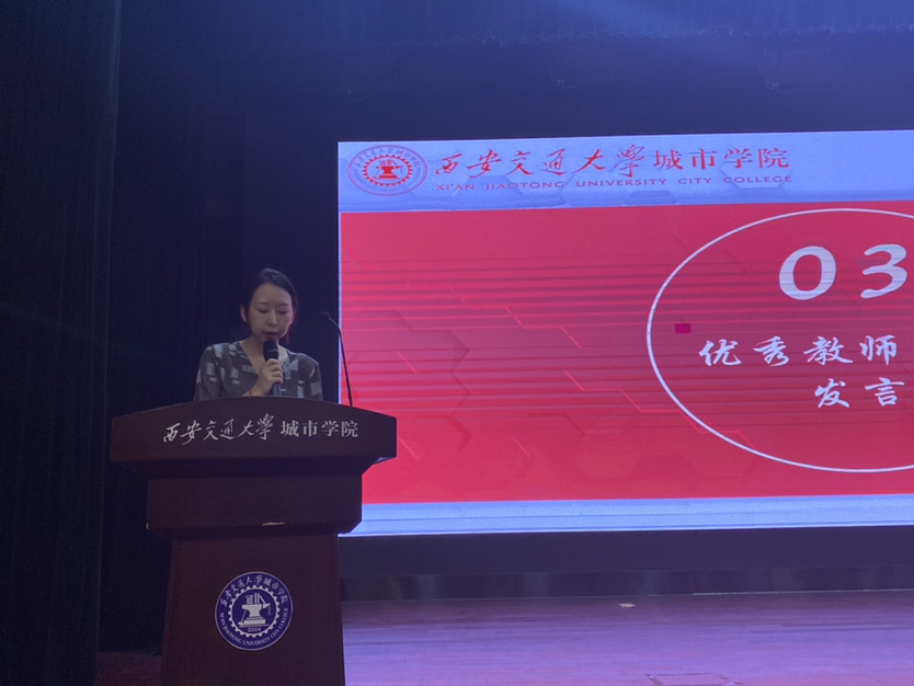 优秀教师代表夏宇佳老师结合毕业学生反馈信息与学生谈心中反馈的“茫、忙、盲”,引导同学们反思校训“尚德笃学、守正创新”中所蕴含的大学要义。进而从往届学生们的得失中告诫在校同学们:大学四年该掌握的核心——学会学习、学会做事、学会做人;在既是师生也是益友的良好互动中,过好四年,促使自己的人格日趋完善。