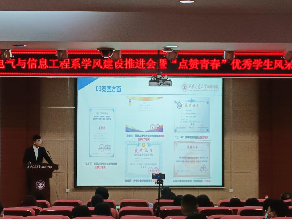 10月6日,电信系2022学年学风建设推进会暨“点赞青春”优秀学生风采展于F100举行。会议全程通过线下+线上腾讯会议直播的方式开展。电信系主任赵录怀、副主任兼中兴学院院长刘晓明、主任助理张建、通信工程专业首席教授冯恩信、自动化专业负责人郭华、电信系无教学任务的班主任、全体辅导员、2022级各班班委线下参会、全体22级新生线上参会,电信系学工负责人王姣主持会议。