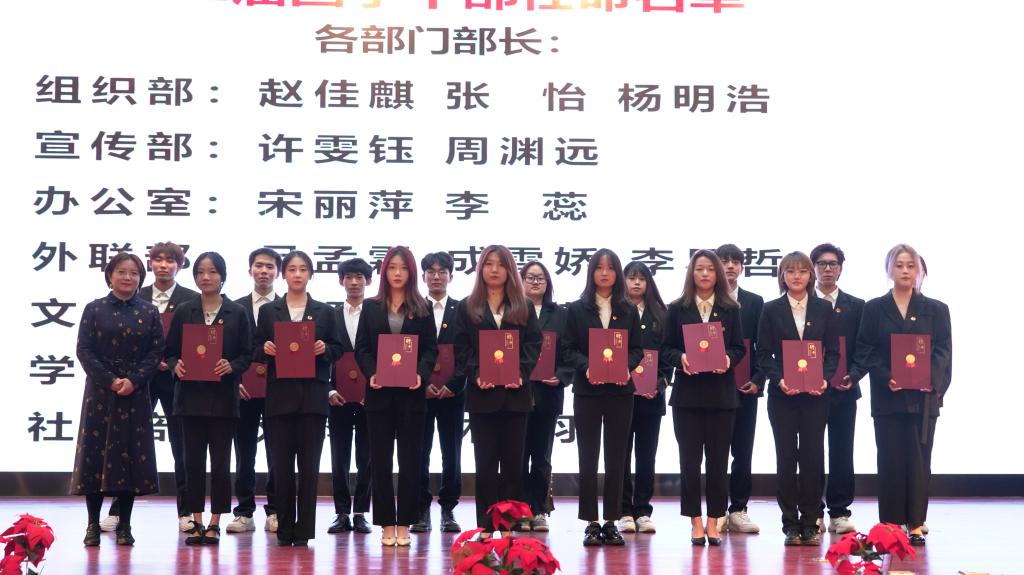 在团学干部表彰环节中,任瑾宣读2021届优秀团学干部名单,杨耀聪为受表彰的团学干部颁发荣誉证书,解文杰同学作为优秀团学干部代表进行发言。在新任团学干部受聘仪式环节中,杨耀聪宣读2022届团学干部任命名单,吴越为新任团学干部颁发聘书。林芷羽同学、席庭薇同学作为新一届团学干部代表分别进行发言。