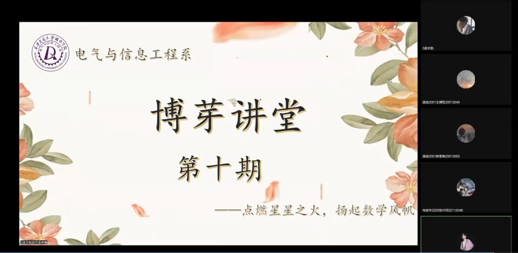 本期“博芽讲堂”——“点燃星星之火,扬起数学风帆”,不仅详细介绍了数学竞赛的具体情况,更是给想要参赛的同学们搭建了答疑解惑的平台,极大地提升和调动了电信系学生对于各项比赛的积极性,也展现了电信系学子勤奋刻苦,敢于突破自我,挑战自我的精神风貌,希望我系学生都能积极参与各类竞赛,争创佳绩!