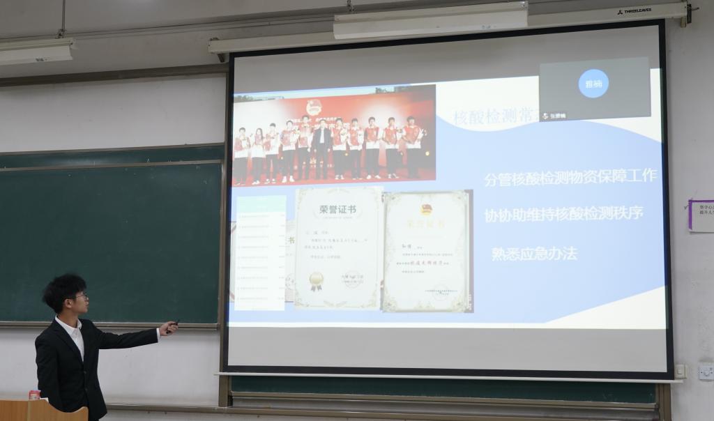 接下来进行的是“优秀学生干部”答辩。参与答辩的学生干部向老师们展示了自己在思想、学习、生活和工作方面取得的突出成绩并对自己下一步的努力方向做出了细致规划。