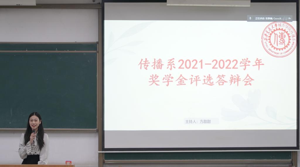 为展示传播系优秀学子风采,提高学生们的答辩能力与综合素养,并向同学们树立可供学习的榜样,传播系于10月20日晚在教学楼B100举办了2021-2022学年奖学金评选答辩会。传播系主任助理杨耀聪、团学工作负责人杨月、辅导员任瑾、助理宁嘉浩和部分学生代表出席此次答辩会。