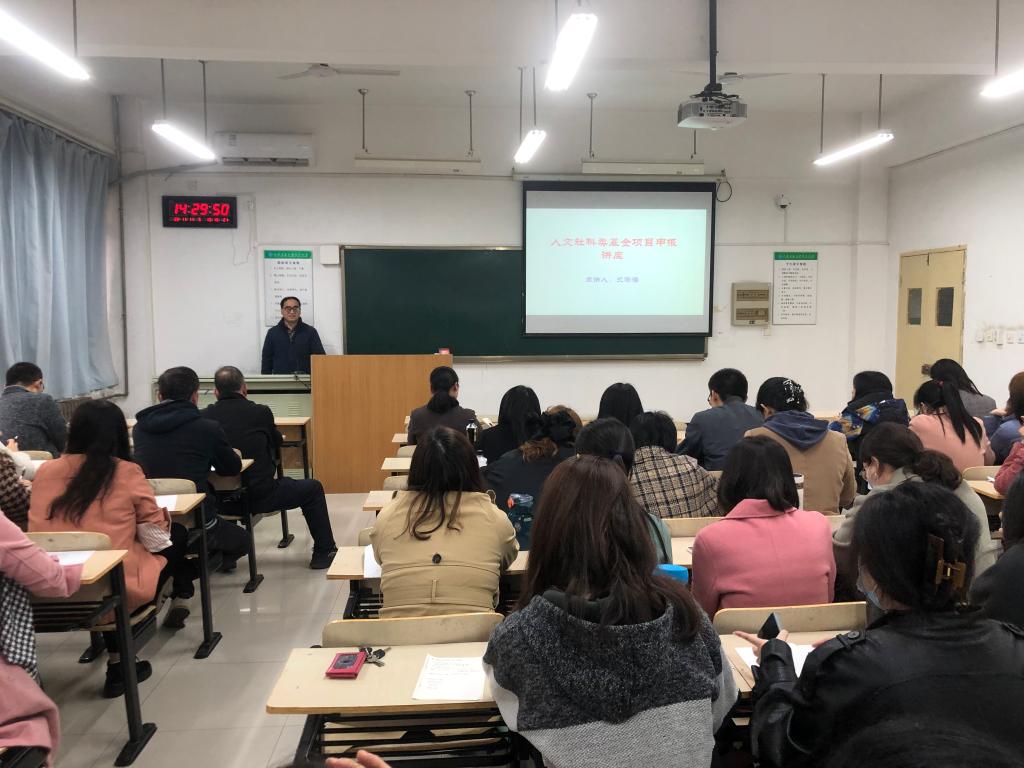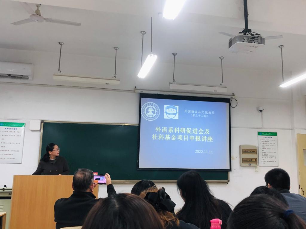 11月11日下午,外语系在教学楼B319举办第三十二期外国语言与文化论坛——“外语系科研促进会及社科基金项目申报讲座”。本次会议由外语系副主任徐素云老师主持、史澎海教授主讲。