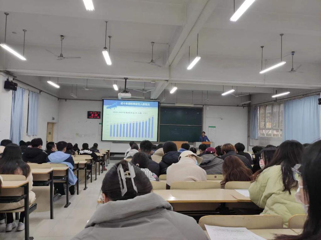 刘敏涛老师详细介绍和分析了2022届毕业生的就业情况。随后他从就业形势和求职新变化、考研和考公情况分析、大学生就业的意义、大学生就业政策、简历制作和求职技巧等方面进行了详细分析和解读,并通过往届学生在求职中的案例向参会学生讲解了个人权益保护、求职注意事项等内容。他指出面对严峻复杂的就业形势毕业学生必须转变求职观念,转换求职思路以应对新形势下的就业新变化,通过切实行动,紧紧抓住就业的“黄金期”。他建议学生在求职过程中要找准个人定位,协调学校、家庭、社会多渠道获取招聘信息和资源支持,通过综合考量选定适合自己的岗位。