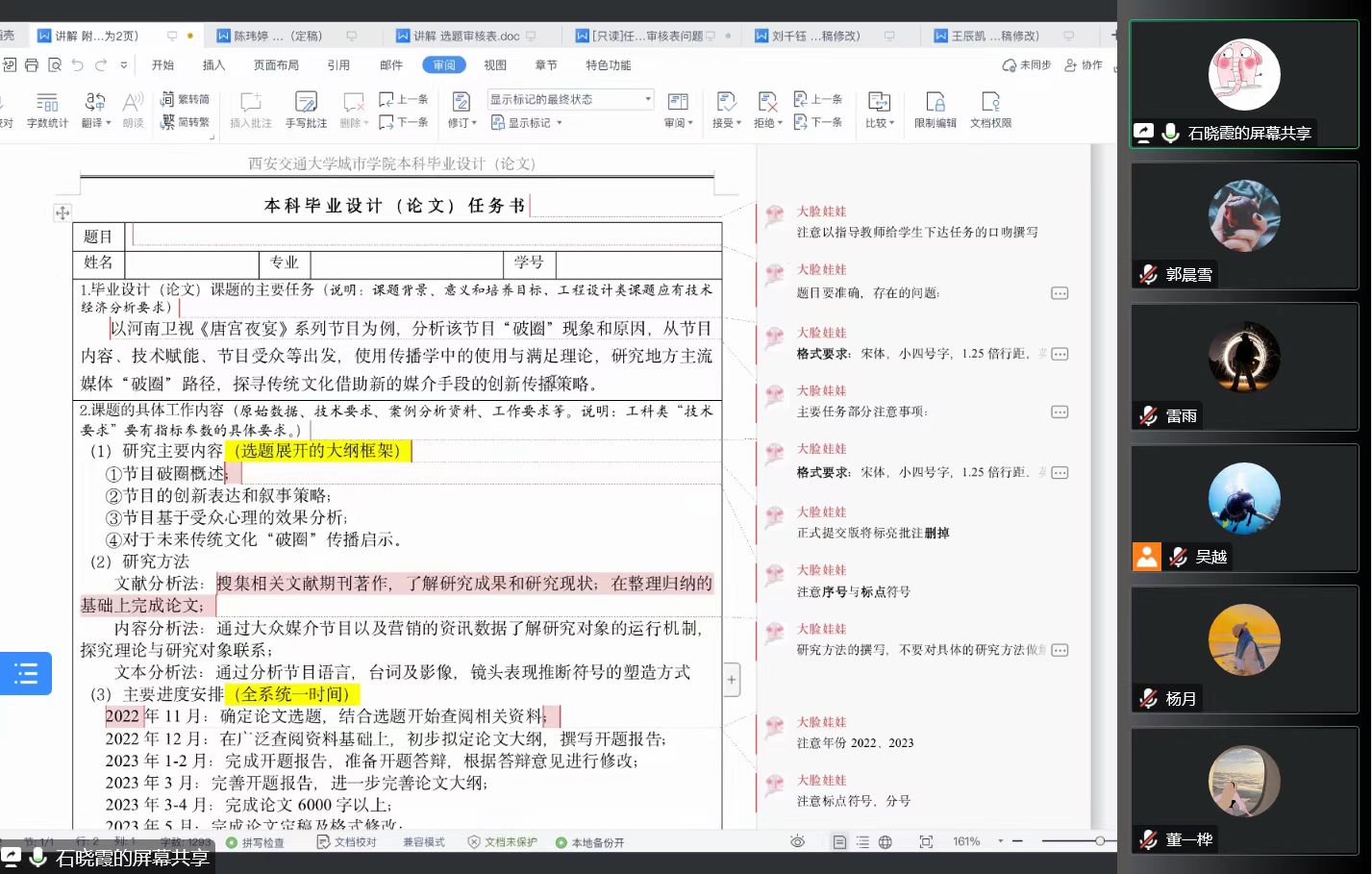 网络与新媒体专业教师石晓霞为大家开展题为《毕业论文<任务书>的撰写心得与注意事项》经验分享。石老师围绕内容撰写和格式要求两方面,对《任务书》要求进行逐项批注,详细讲解。随后,吴老师对毕业论文《任务书》以及毕业论文《开题报告》工作作推进安排。