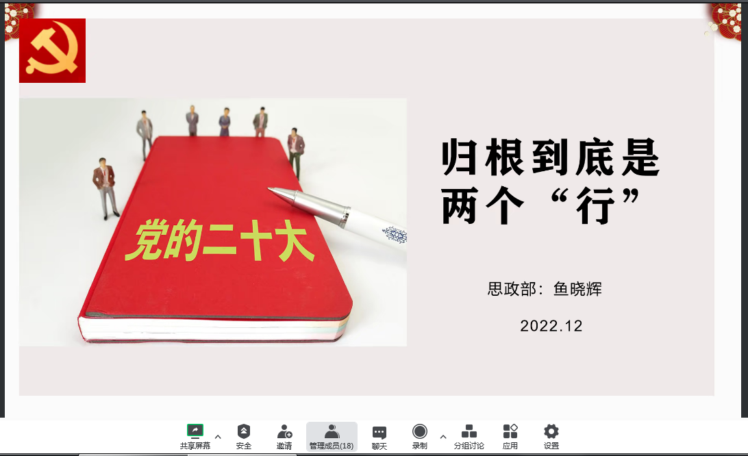 为进一步学深悟透党的二十大精神,12月8日上午,机关第五党支部在线上召开学习贯彻党的二十大精神宣讲报告会。本次报告会邀请思想政治理论教学部鱼晓辉主讲,会议由支部书记张超主持。