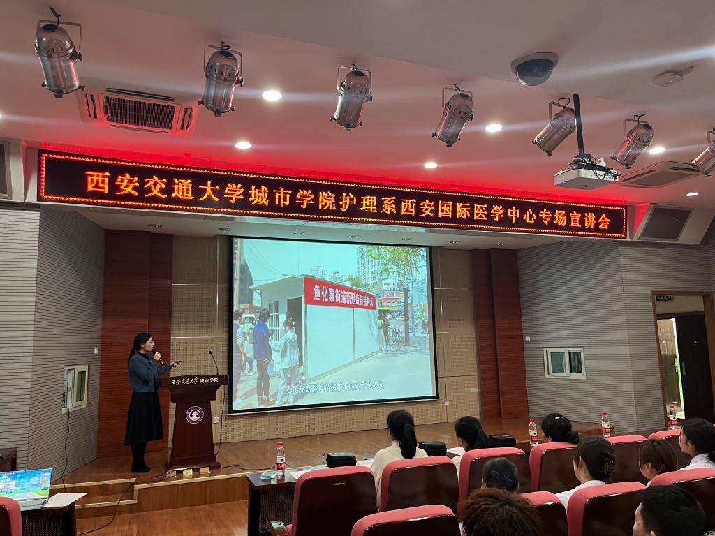 yl7703永利官网护理系于3月14日下午在F100举办西安国际医学中心医院就业与实习宣讲会。参加本次宣讲会的有西安国际医学中心医院总护士长于颖、护理部干事李晓丹、神经外科监护室护士长韩海静、消化内镜护士长冀研研,学院护理系常务副主任王梅芳、主任助理李楠、学生工作负责人王娇丹、2023届毕业班辅导员、全体毕业生及2020级护理专业学生。