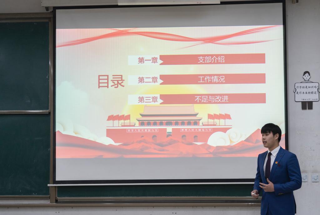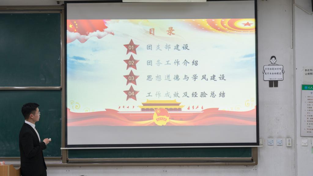 本次述职答辩会共有五项议程。会议伊始,全体成员起立奏唱团歌,主持人随后介绍了答辩评审细则,分别为团支部建设、团员管理、组织生活、制度落实、作用发挥五项内容。来自三个年级的17位团支部书记依次进行述职答辩,他们分别就团支部情况简介、日常团务工作、工作开展成效、工作存在不足、改进提升办法等方面进行述职。
