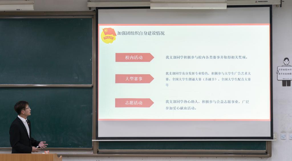 为进一步加强基层团组织规范化建设,激发团组织活力,不断完善基层组织考核制度,全面总结上一学年各团支部工作完成情况,传播系团工委于3月21日晚在B100召开基层团支部书记述职答辩会。传播系主任助理杨耀聪,团工委书记陈欣,辅导员杨月、任瑾及各团支部书记出席本次会议。