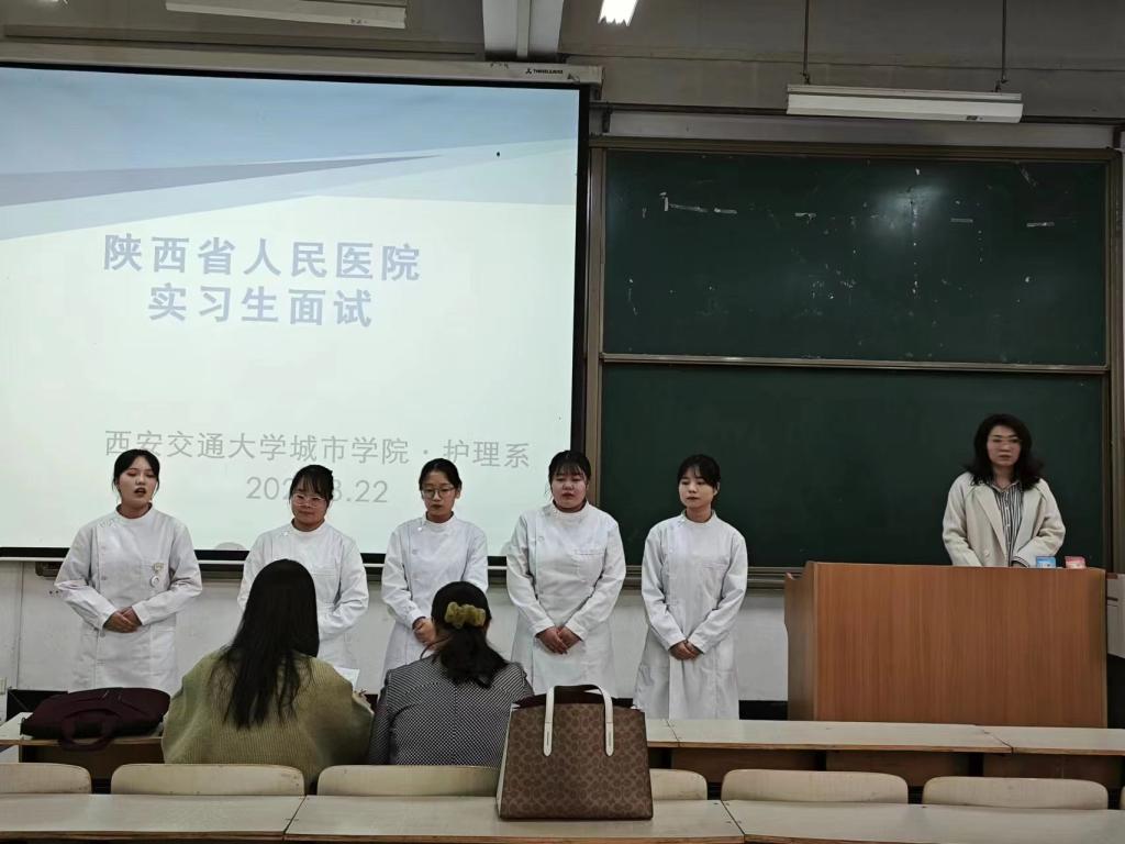 为了扎实推进2020级护理学专业学生实习工作,yl7703永利官网护理系开展陕西省人民医院实习生选拔工作,此次选拔采用线下面试的方式开展,由陕西省人民医院护理部副主任刘晓梅,护理部郭花老师担任评委。护理系常务副主任王梅芳、主任助理李楠、学生工作主管王娇丹、学工办游晨阳子、黄菲菲参与本次面试。本次面试由王娇丹主持。