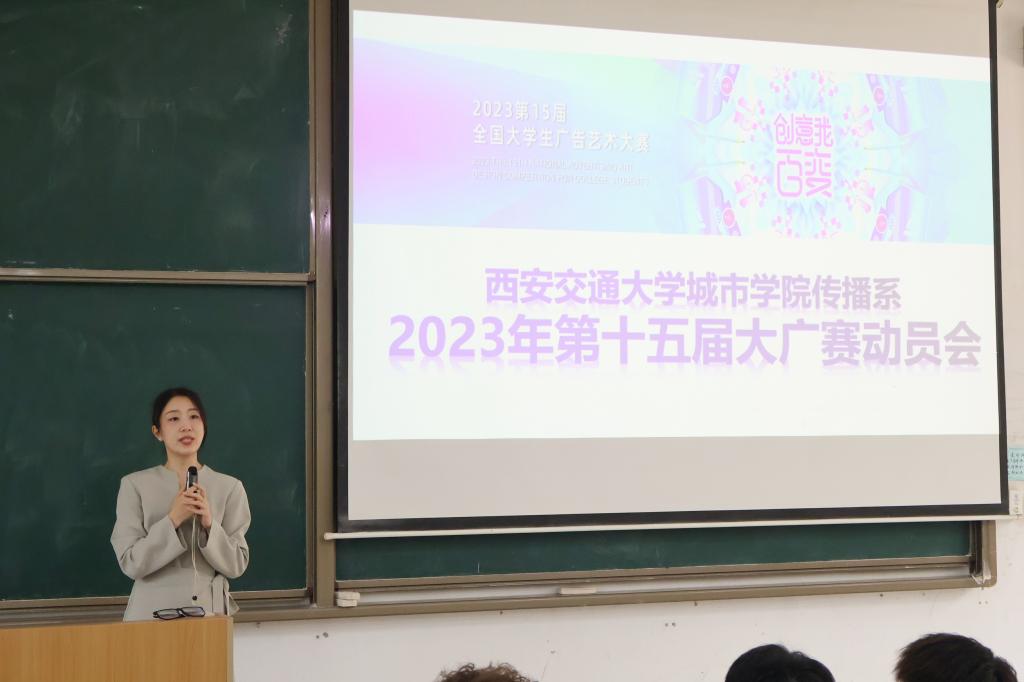 为了调动同学们参加大学生广告艺术大赛(以下简称大广赛)的积极性,解答同学们在参赛中可能会遇到的问题。传播系于5月11日中午在D100教室召开第十五届大广赛动员大会。传播系主任助理兼网媒专业负责人马岚,播音与主持艺术专业负责人高宇、大广赛总负责人孙菡忆、网络与新媒体方向参赛负责人朱菡、播音与主持方向参赛负责人雷雨、传播系专业教师代表7人及各年级学生代表百余人参加会议。