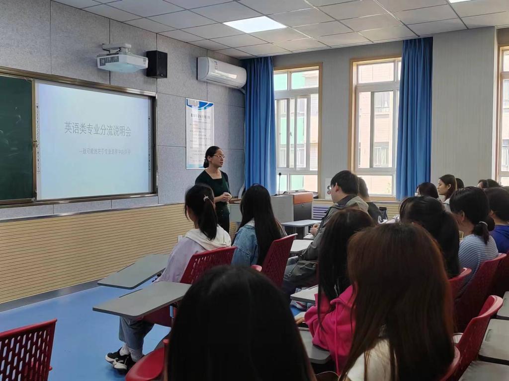 为帮助2021级英语类专业学生明确个人兴趣,解答学生对专业分流的困惑,更好地推进专业分流工作的开展,外语系于5月12日在B306召开英语类专业分流说明会,系副主任徐素云主讲,2021级全体学生参加。