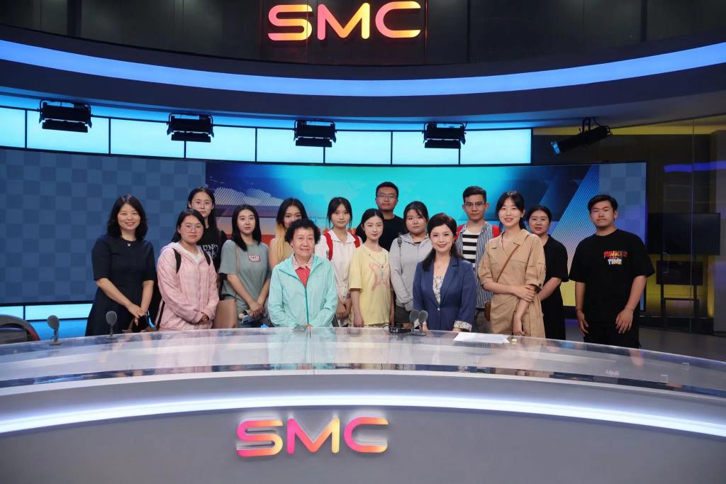 同学们在企业老师的讲解下走进融媒体制作中心,深入了解新闻节目制作流程。进入直播监控室,通过直播大屏的展示可以充分看到直播时的整体情况。站在二楼的圆环走廊上,俯视新闻中心,整个工作区被合理安排,分工有序,并且设置了多块竖屏以便适应当下新媒体的传播方式。在新闻直播区,老师与同学们亲身体验了新闻直播的过程。