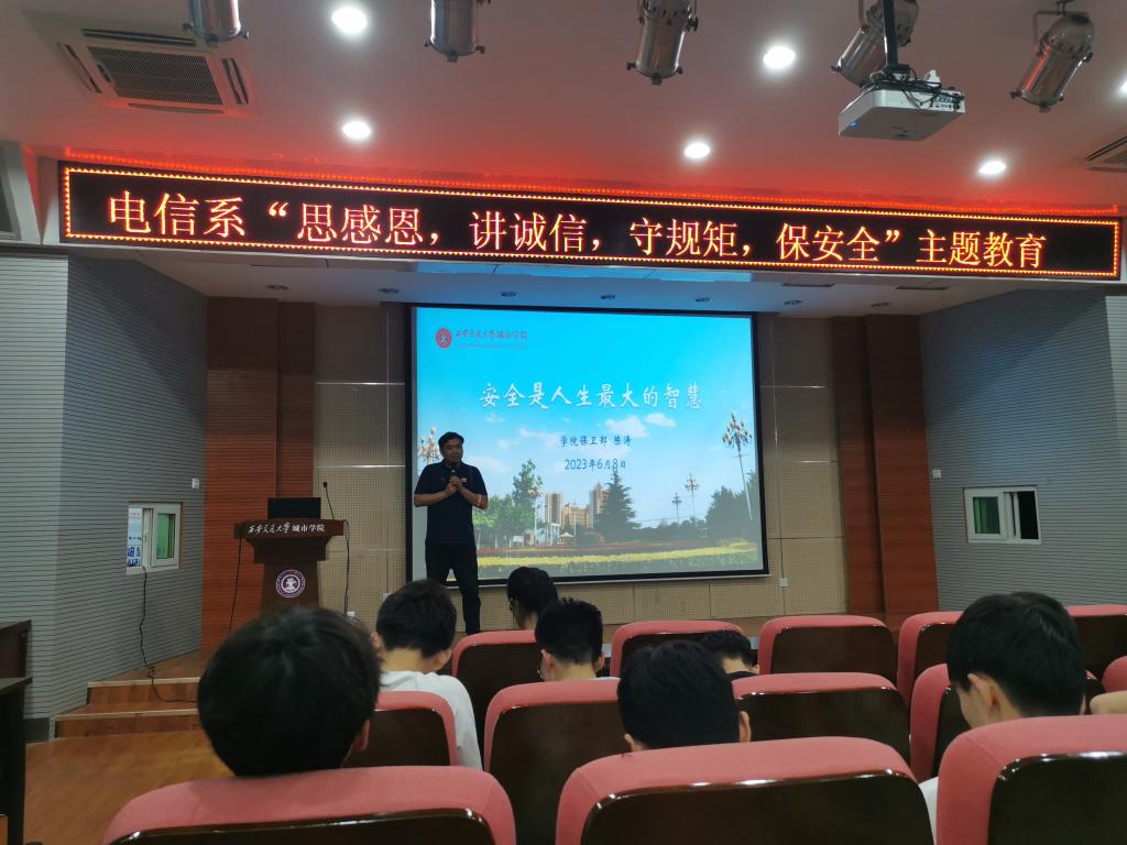 为增强大学生的诚信意识,提高大学生的综合素质,强化育人成效,6月8日电信系在教学楼F100举办“思感恩,讲诚信,守规矩,保安全”主题活动。邀请学院保卫部部长陈涛为学生进行预防电信网络诈骗和校园安全方面主题讲座。电信系主任助理王姣、辅导员张华、马麒淇及大一至大三年级学生代表参加本次讲座。