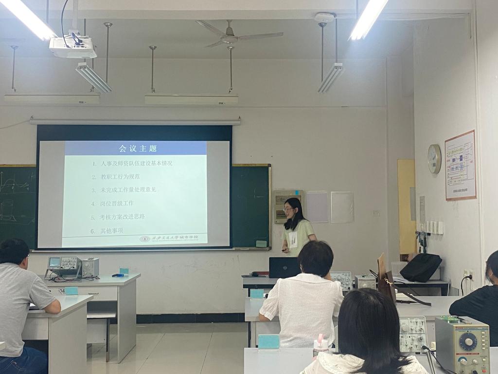 会上,由袁芳老师将近期学院人事会议精神进行传达。主要包括人事及师资队伍建设基本情况、教职工行为规范、未完成工作量处理意见、岗位晋级工作注意事项、考核方案改进思路、其他事项六个部分,进行了详细的介绍。