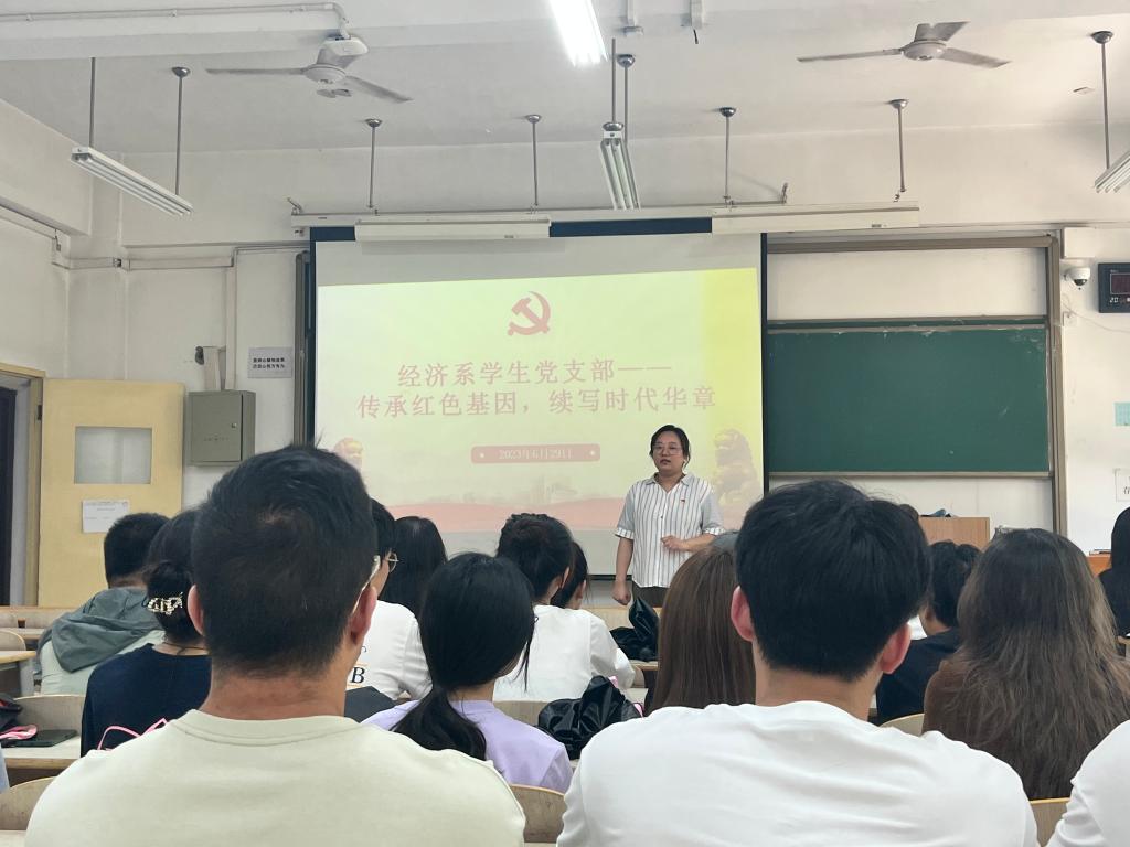 为庆祝中国共产党成立102周年,加强学生党员的思想政治教育,进一步增强学生党员的凝聚力和战斗力,经济系学生党支部于6月30日在D109开展了“传承红色基因、续写时代华章”主题党日活动。学生党支部书记廉宇婷、组织委员杨静怡、宣传委员张进及全体学生党员参加了本次活动,本次活动由杨静怡主持。