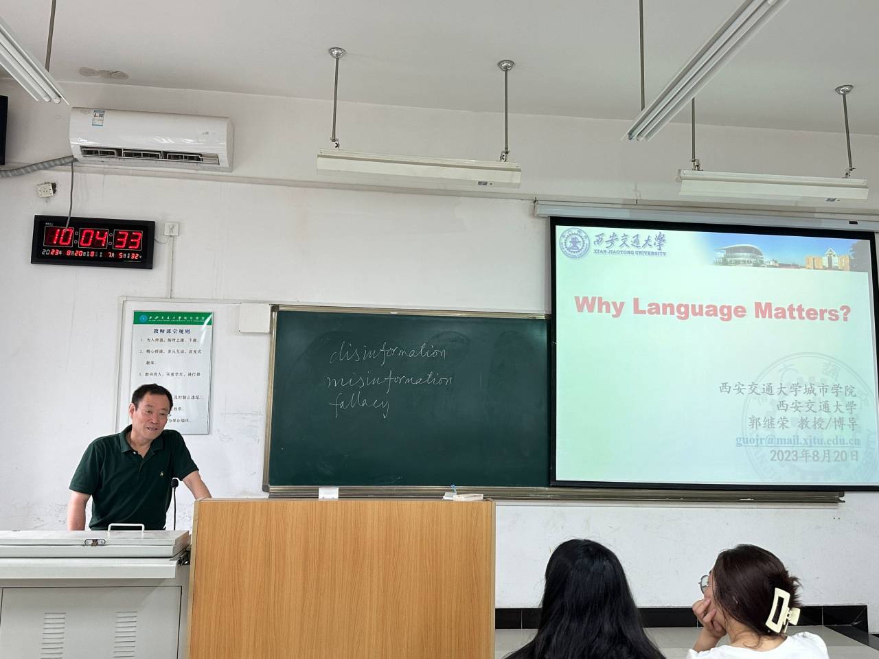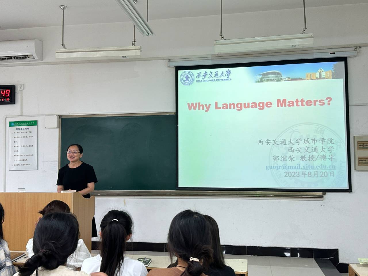 外语系系主任郭继荣以“Why language matters?”为出发点,向学生阐述了中西方文化的差异,强调了语言文化的重要性,介绍了语言和心灵、精神之间的关系,想要学好一门语言就必须深挖文化根基,关注时事新闻,联系国内、国际形势,并结合当下选专业与就业热点话题,向同学们传达作为当代大学生需要成为“复杂”而非“简单”思考能力的群体,科学判断、理性思考,切勿出现从众、盲从、急功近利的心理。