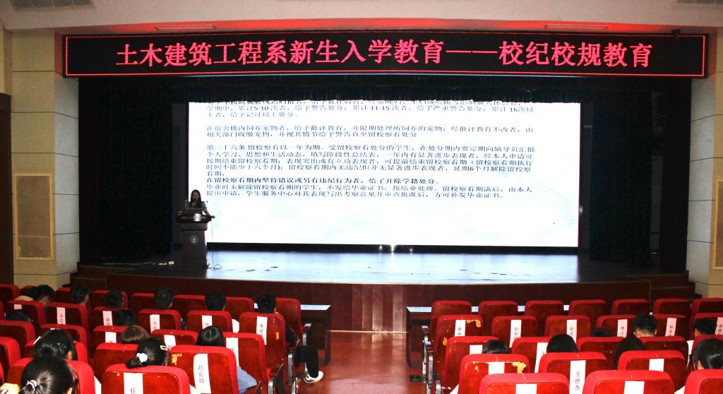 为了让2023级新生更快适应校园生活,土建系于9月11日在教二报告厅组织开展了新生入学教育之校规校纪及行为规范教育。本次入学教育由土建系团工委书记康璐主讲。