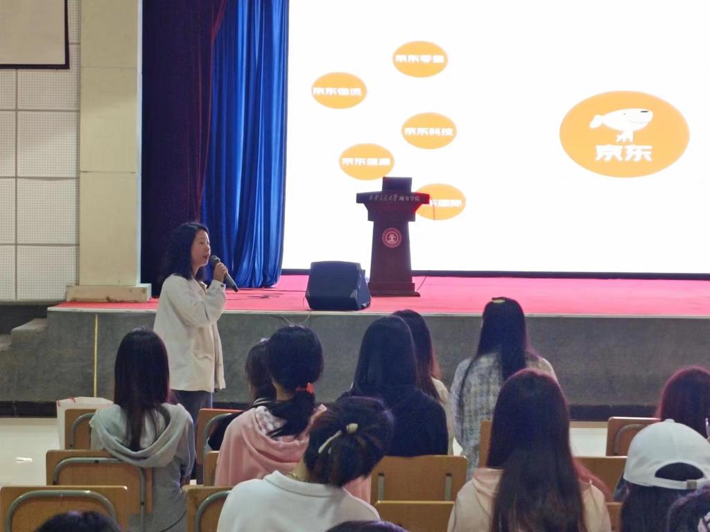 招聘会开始,贾菁经理先以简洁明了的几个数字带动大家进入招聘会这个话题中,同时京东文景路营业部负责人张波学长给现场同学发放了京东集团带来的小礼品和企业宣传册,让同学们对京东集团有了初步的认知与了解。随后,贾菁经理以管理系的专业出发,对企业所需要的专业性人才进行了详细的介绍,从多个方面解开了同学们的就业的疑惑,让大家对四年所学如何运用有了更加深刻的认知。临近结束,管理系毕业生张波学长给大家分享了自己在京东的工作经历以及自己的职业生涯经验。最后,贾菁经理为在座毕业生进行了就业问题的解答,张波学长收取了在座有意向的毕业生简历,多名同学和京东达成实习、就业意向。