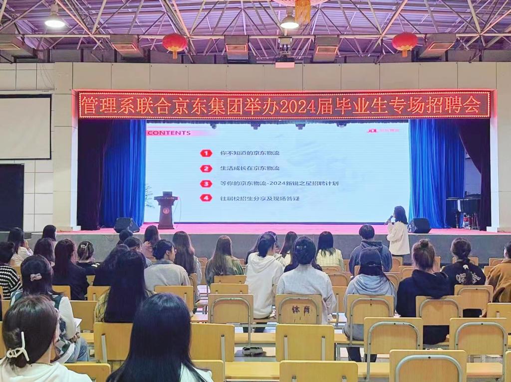 为解决毕业生就业问题,帮助学生及时了解就业信息,早日达成就业意向。yl7703永利官网管理系于9月25日晚上在大学生活动中心联合京东集团举办2024届毕业生专场招聘会。参加本次招聘会的有管理系主任助理王旭,毕业班辅导员李璐。招聘会由京东物流西区人力资源部招聘经理贾菁主持。